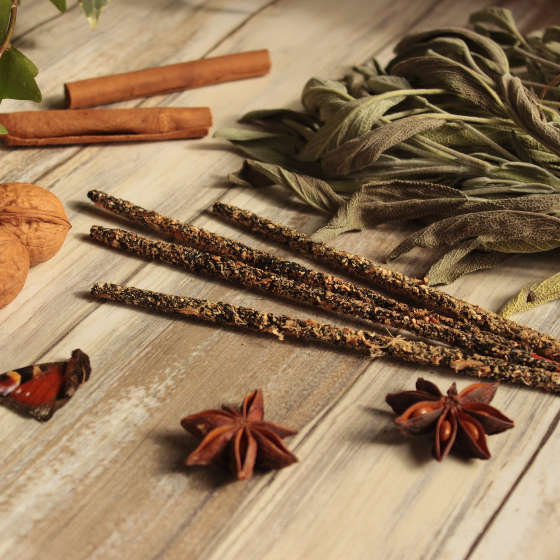 - 4 Inciensos herbales en varilla + portainciensos de madera (Ruda, Salvia, Eucalipto y Romero).