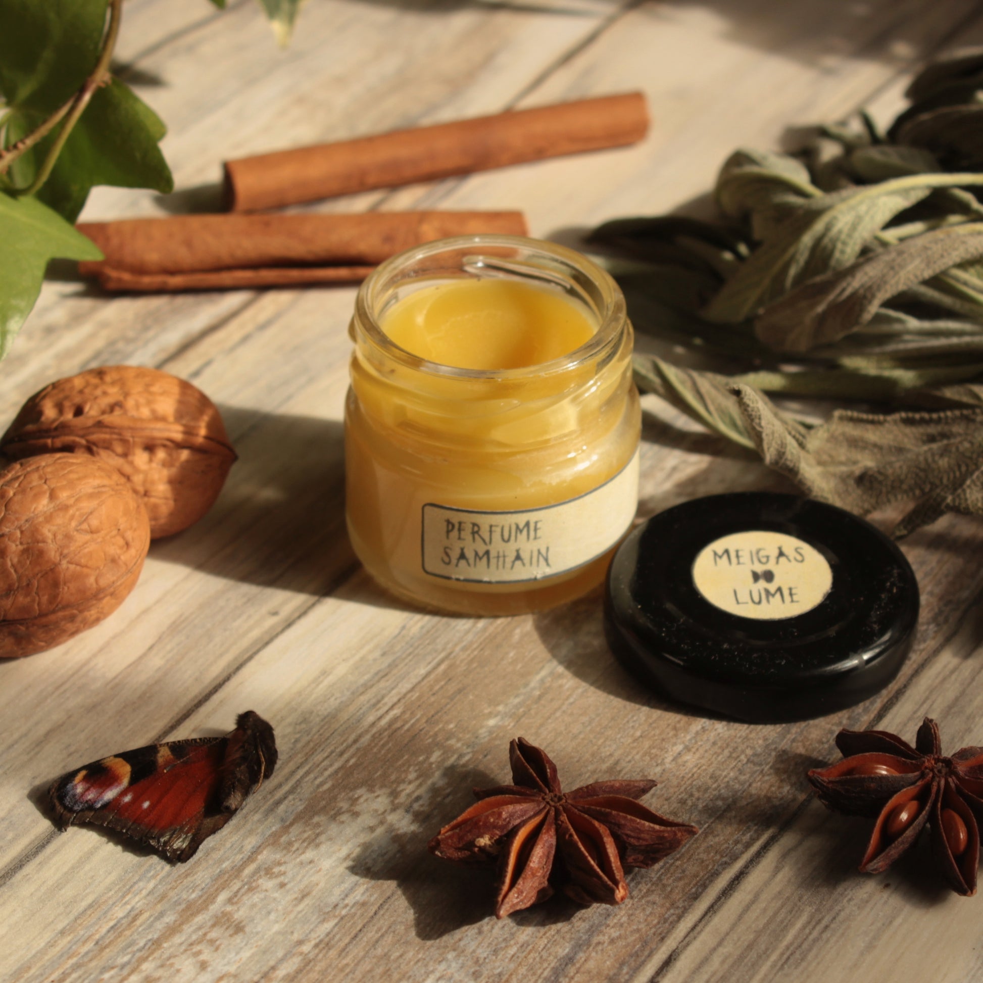 - Perfume sólido de Samaín en bote de vidrio reurilizable.